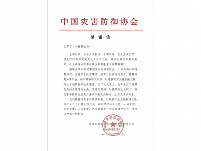 三一基金会持续积极与全国各地基层救援队伍建立深度合作关系,依托三一集团的产业优势,为多个救援队伍配备应急救援器材装备、提供专业救援技术指导和培训支持,增强基层队伍的风险防范、先期处置和自救互救能力,推动“企业+社会组织+一线队伍”的协同应急救援模式落地见效。凭借在历次灾害突袭时的挺身而出,用实际行动践行“人民至上,生命至上”的使命担当,三一基金会获中国灾害防御协会颁发感谢信。
