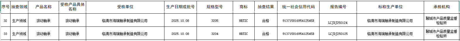近日,聊城市市场监督管理局公布2025年滚动轴承产品质量市级监督抽查结果。临清市海瑞轴承制造有限公司生产的3205、3204两款型号轴承产品,经检验判定为合格。