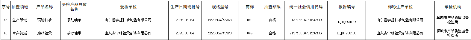 近日,聊城市市场监督管理局公布了2025年滚动轴承产品质量市级监督抽查结果。山东省宇捷轴承制造有限公司生产的22205CA/W33C3、22206CA/W33C3两款轴承产品,凭借过硬的产品质量,顺利通过本次监督抽查,检验结果为合格。